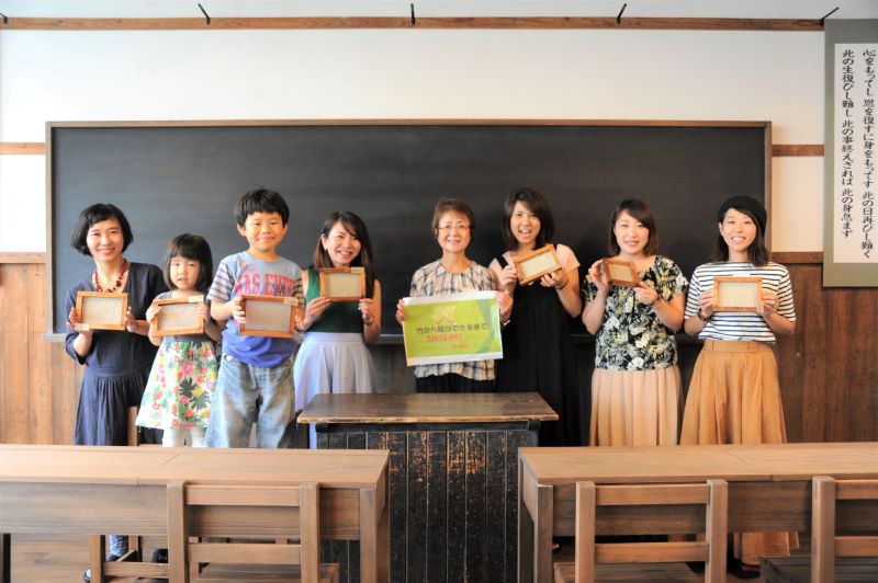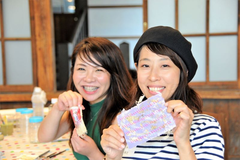 体験プログラムでは、ポストカードサイズの紙漉きのほか、垰山さんの竹紙でお好みの作品をつくることができます。あたたかな灯りを透過するランプシェードや弥富地区産のそば殻で模様をつけるコースター、紙の凹凸を生かしたタペストリーやマグネットなど、表現は多彩!